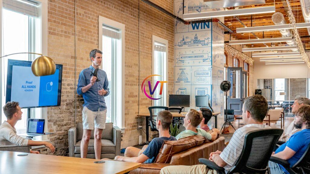 Alt text: A team in an office discussing customer journey automation during a meeting